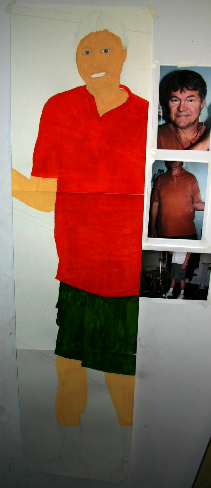 preconceived ideal. Not that I am ideal, lol. I lined up this drawing with what I was wearing so it is accurate with the length of things. I did have to shorten up things a little to be able to fit on the 72 inch paper(I'm 73 inches tall). Either way I need to break myself of that bad habit. I am trying a new medium with the watercolors. First time trying them at all. Is that crazy or what to try a new thing for the final project? Still need to do a lot to it like shading, the folds and twist in my clothes, and the background. I still have 2-3 weeks to complete it. I'm basing it off the 3 photos on the right.